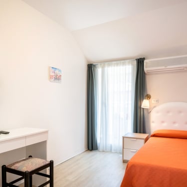Camera con letto letto singolo, dotata di balcone, aria condizionata autonoma, TV, cassaforte e bagno privato rinnovato con bidet, box doccia e asciugacapelli.